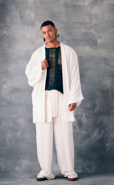 El set está compuesto por un pantalón amplio y una sobrecamisa fluida en lino 100% natural color crudo, que aporta ligereza, frescura y movimiento. Su confección limpia y estructurada refleja la estética minimalista de la colección, inspirada en la serenidad de los paisajes colombianos reinterpretados bajo la mirada moderna de Nueva York.
